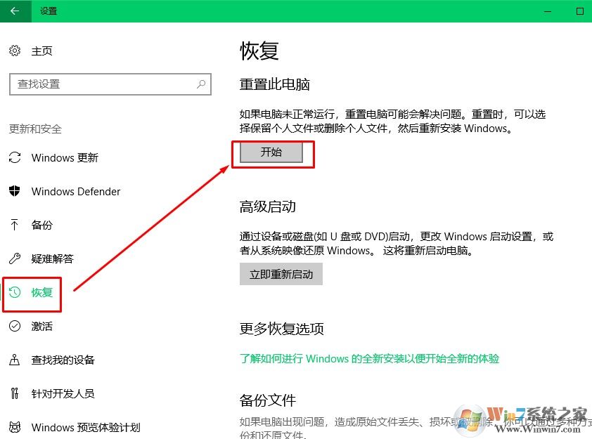 2、選擇恢復(fù),然后在重置電腦下選擇開始即可。