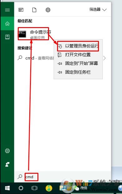 1、win+s打開小娜輸入cmd并右鍵選擇已管理員身份運(yùn)行。