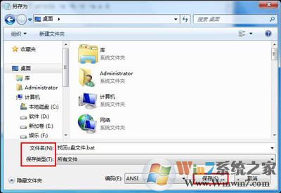 2、接著將文件另存到u盤(pán)中,將文件命名為“找回U盤(pán)文件.bat”,保存類型設(shè)置為“所有文件”,點(diǎn)擊“保存”即可,如下圖所示: