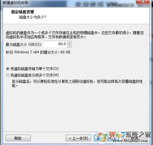 5、選擇虛擬機(jī)文件大小,一般Windows7 建議是60G左右,文件建議單個(gè),方便管理;