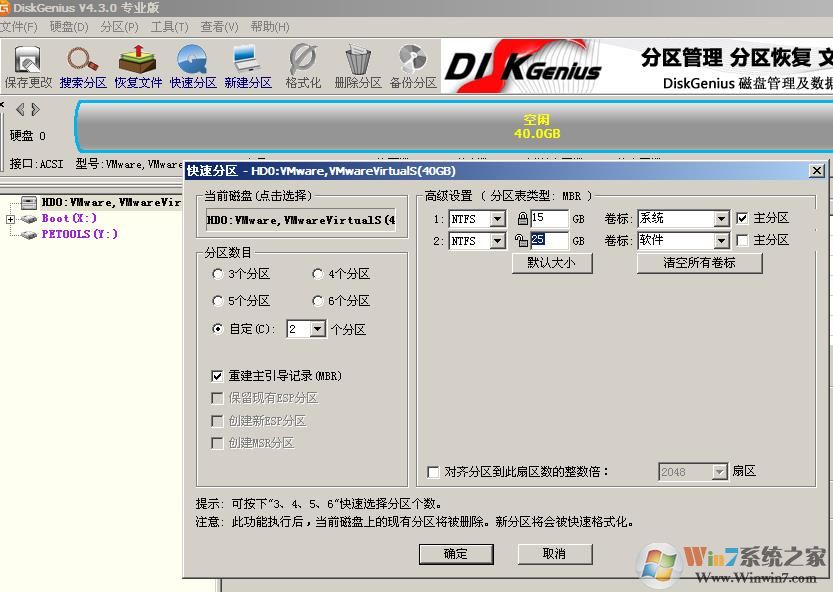 12、使用PE中的diskgenius 把新硬盤分區(qū),小編建議分為兩個(gè)區(qū)即可,使用快速分區(qū)功能,很簡(jiǎn)單;