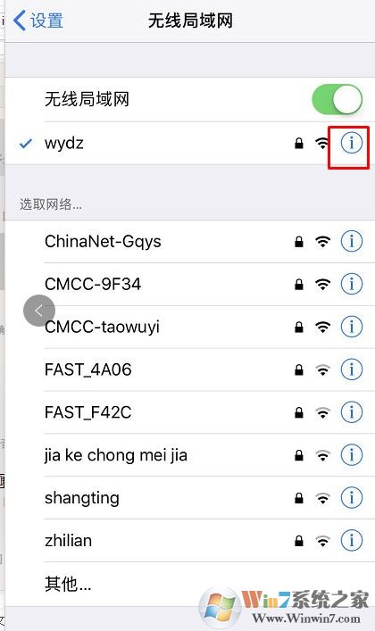 4、接著在右窗格中可以看到當(dāng)前 iPad 連接的無線網(wǎng)絡(luò),請點擊右側(cè)的嘆號圖標,