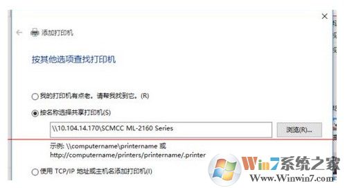 3、這個(gè)時(shí)候點(diǎn)擊“我需要的打印機(jī)不在列表中”它,在彈出的新窗口中,可以看到5個(gè)單按鈕。選擇第二項(xiàng)“按名稱選擇共享打印機(jī)”,并點(diǎn)擊“瀏覽”。不選擇第三項(xiàng),是因?yàn)榈谌?xiàng)成功率不高。