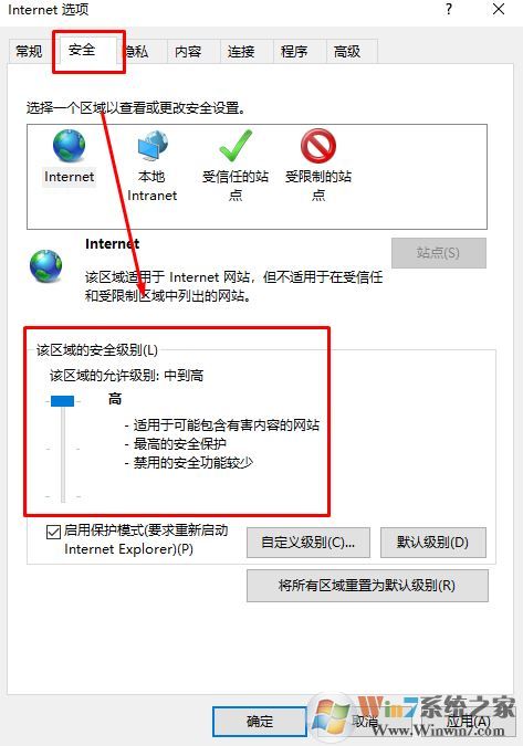 2、打開internet 選項(xiàng)后,切換到【安全】選卡,然后在下面我們可以看到 該區(qū)域的安全級(jí)別,如下圖所小編紅框框選的位置,將藍(lán)色滑塊移動(dòng)到最上面“高”,然后點(diǎn)擊確定保存設(shè)置;