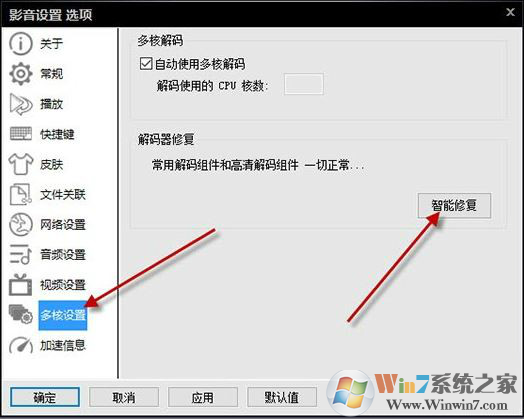2、在彈出的菜單欄中,選擇“多核設(shè)置”,在點(diǎn)擊“智能修復(fù)”。