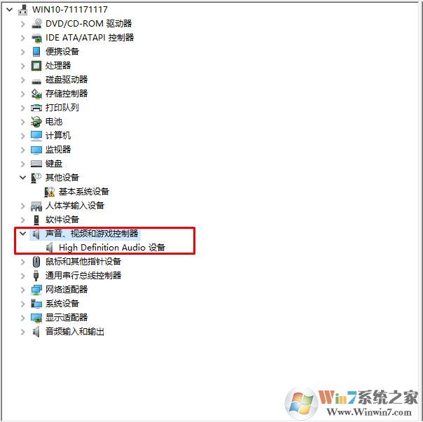 2、在打開界面中,我們找到聲音、視頻和游戲控制器 ,然后展開,這時我們可以看到聲卡: high Definition Audio設(shè)備 就是聲卡了。