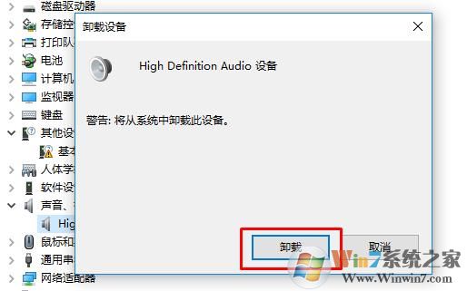 4、出現(xiàn)卸載設(shè)備確認提示框,我們再點擊確定;