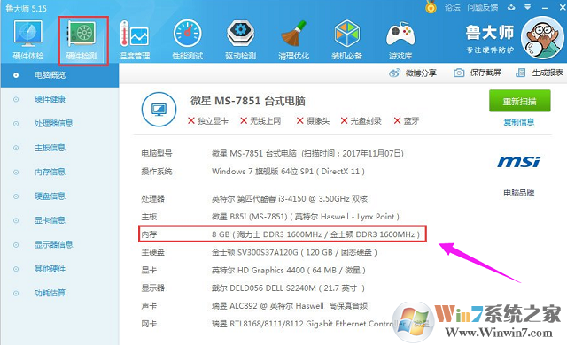 1、安裝魯大師,成功后,打開魯大師軟件,可以看到電腦概覽中清晰的顯示了各個硬件的具體信息,其中包含了內(nèi)存的頻率。