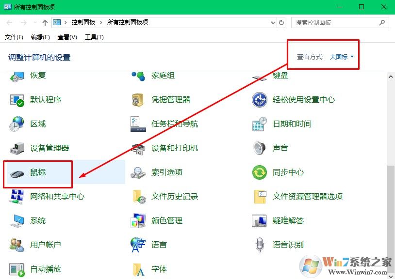 2、進入控制面板后,在“查看方式”為大圖標或者小圖標的情況下,點擊打開“鼠標”;