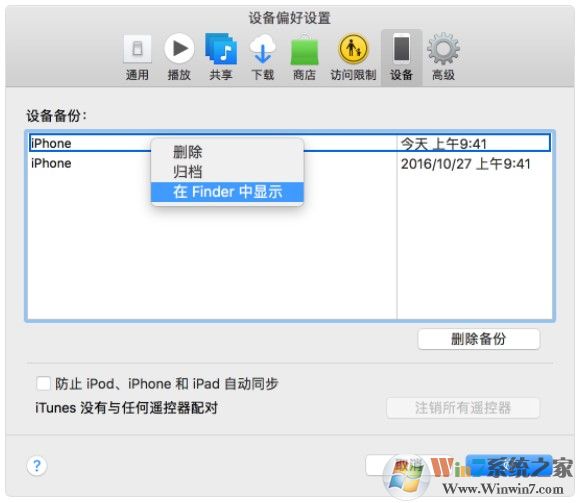 3、按住 Control 鍵并點(diǎn)按所需備份,然后選取“在 Finder 中顯示”。