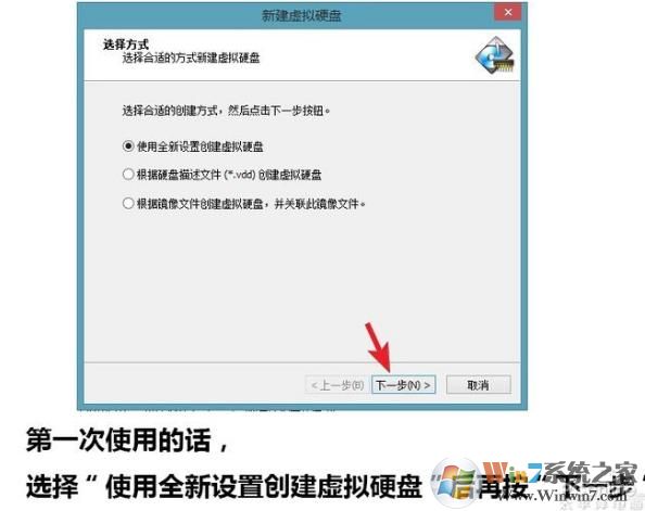 4、使用全新的設(shè)置創(chuàng)建虛擬硬盤,點(diǎn)下一步;