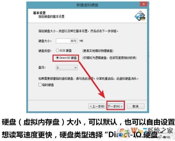 5、硬盤的大小可以默認(rèn),也可以自由設(shè)置,總之要留內(nèi)存給系統(tǒng)用~想讀寫速度快,那么選擇 direct-io 硬盤