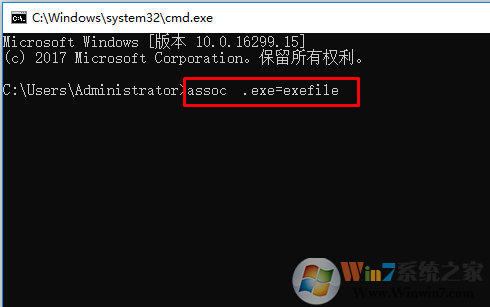 2、輸入assoc .exe=exefile〔assoc 與.exe 之間要有空格〕重新建立關聯(lián)!