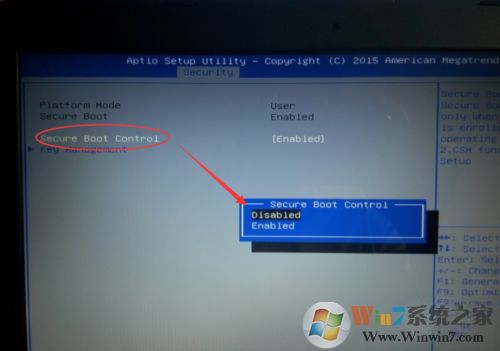 6、在security選項(xiàng)下找到Secure Boot 這個(gè)選項(xiàng),按下回車,將原來(lái)的Enabled開啟修改為 Disabled 關(guān)閉;