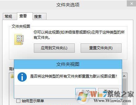 2、在文件夾選項(xiàng)“查看”選卡中點(diǎn)擊“重置文件夾”,重置完成后點(diǎn)擊“確定”然后重啟計(jì)算機(jī)即可。