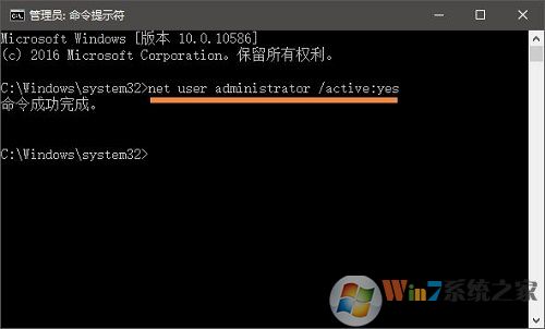 5、在命令提示符中輸入:net user administrator /active:yes 按下回車鍵即可;