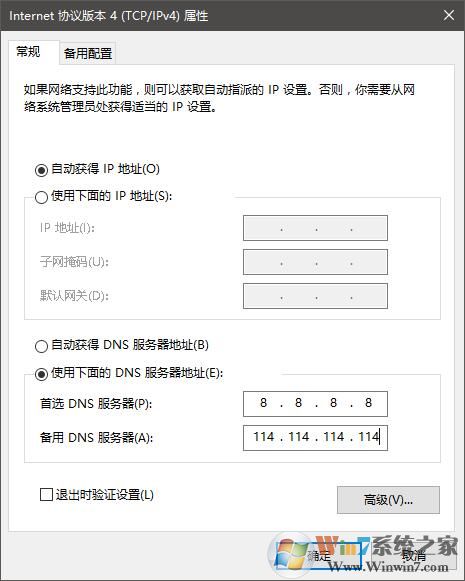 5、看到界面點擊選擇“使用下面的dns地址”,首選dns地址可以填上8.8.8.8,備用dns地址可以改成114.114.114.114。