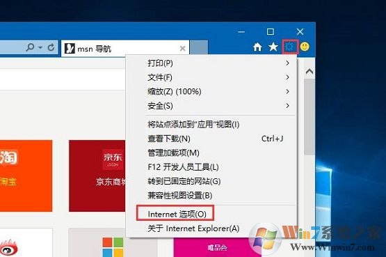 2、打開IE瀏覽器,點擊設置按鈕,選擇“Internet選項”;