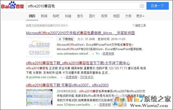 1、在百度中輸入查找關(guān)鍵字“office2010兼容包”,出現(xiàn)很多的搜索結(jié)果;