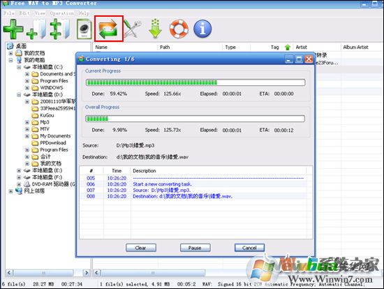 6、設(shè)置完成以后,用戶只要單擊主界面上方的“轉(zhuǎn)換”按鈕即可開始轉(zhuǎn)換音頻文件,同時在主界面中彈出音頻轉(zhuǎn)換窗口,在此用戶可以了解音頻文件的轉(zhuǎn)換進度。