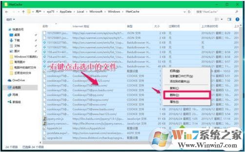 5、INetCache文件夾顯示的都是IE臨時(shí)文件,我們按下鍵盤上的Ctrl+A鍵,選中全部臨時(shí)文件,右鍵點(diǎn)擊,在右鍵菜單中點(diǎn)擊:刪除;