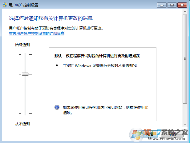 ?、冢簝H在程序嘗試對(duì)我的計(jì)算機(jī)進(jìn)行更改時(shí)通知我:這是Win7默認(rèn)的選項(xiàng)。選擇該選項(xiàng)后,用戶手動(dòng)修改系統(tǒng)設(shè)置也不會(huì)彈出授權(quán)要求,當(dāng)程序修改系統(tǒng)或運(yùn)行系統(tǒng)配置程序時(shí)才要求用戶授權(quán)。