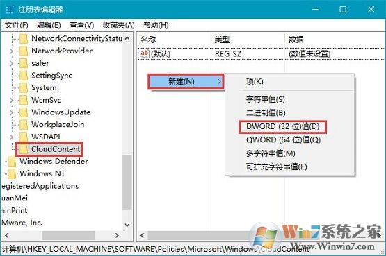 3、點(diǎn)擊CloudContent項(xiàng),在右邊空白處新建一個(gè)DWORD(32位)值,重命名為“DisableWindowsConsumerFeatures”,如圖所示: