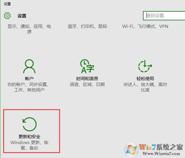 1、首先按組合鍵win+i打開系統(tǒng)設(shè)置窗口,然后點擊更新和安全選項,如圖所示: