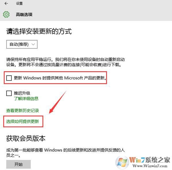 3、接著先取消勾選“更新windows時提供其他microsoft產(chǎn)品的更新”,再點擊“選擇如何提供更新”,如圖所示: