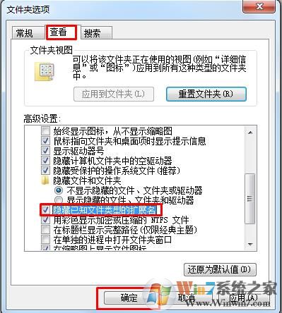 2、然后點(diǎn)擊查看標(biāo)簽,在下面的高級設(shè)置中,找到”隱藏已知文件類型的擴(kuò)展名“,勾選,然后點(diǎn)確定就可以了!