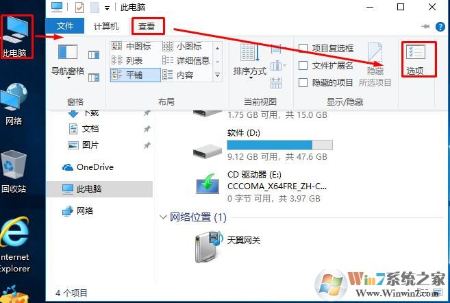 1、打開桌面上的“此電腦”,或隨便一個文件夾,然后點(diǎn)擊 查看 再點(diǎn)擊 選項(xiàng),如下圖所示;