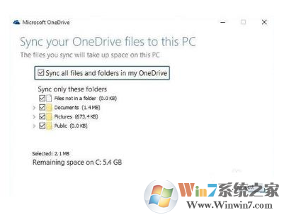 接下來,您會被要求選擇OneDrive文件和文件夾,你想同步。 默認情況下,所有的文件和文件夾會從你的云帳號同步到PC上的本地存儲位置,但是如果你想更選擇性的這一點,你可以取消勾選旁邊的框“同步所有文件”,然后從中選擇單個文件夾。