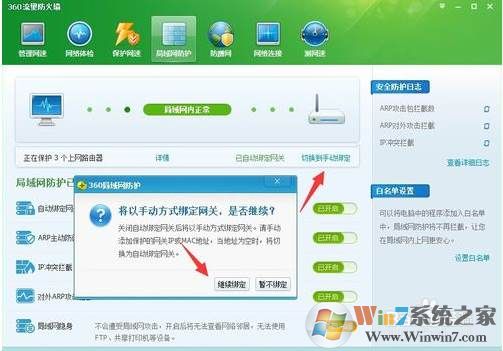 3、打開“流量防火墻”工具,切換到“局域網(wǎng)防護”選項卡,點擊“切換到手動綁定”按鈕,并從彈出的窗口中點擊“繼續(xù)綁定”按鈕。