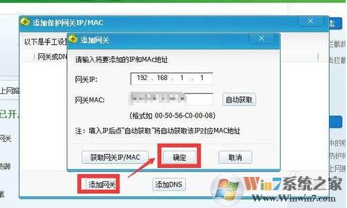 4、此時將打開“添加保護網(wǎng)關IP和MAC”窗口,在此界面中添加網(wǎng)關的IP地址和MAC地址并進行手動綁定操作。