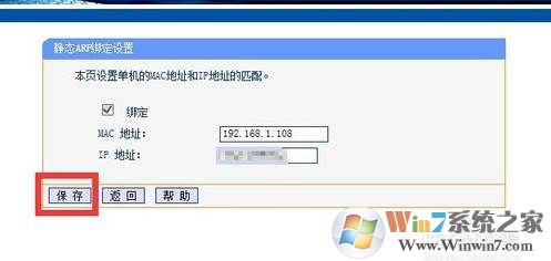 7、最后我們需要在路由器端將各臺計算機進行IP和MAC綁定操作。進入路由器后臺管理界面,切換到“IP和MAC綁定”-“靜態(tài)ARP綁定設置”項,選擇“啟用ARP綁定”項,點擊“保存”按鈕。m.cncxm.com