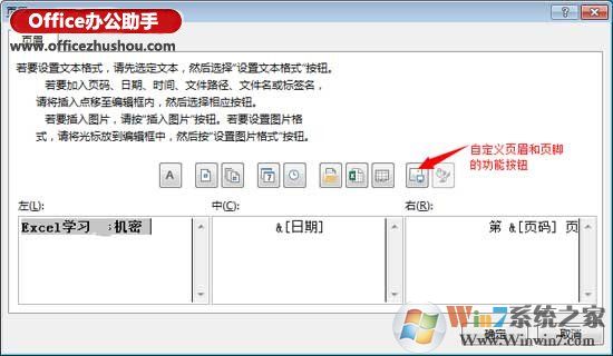 3、自定義頁眉或者頁腳:點擊自定義頁眉或者頁腳以后,會彈出一個新的對話框,在一個新的對話框中,可以根據(jù)功能按鈕自定義頁眉或者頁腳。