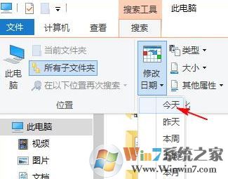 2、然后點(diǎn)擊“修改日期”按鈕即可顯示前面提到的固定日期范圍“今天、昨天、本周、上周、本月、上月、今年、去年”,任意點(diǎn)擊一個(gè)日期范圍,例如“今天”。文件資源管理器窗口右上角的搜索框中即顯示“修改日期:今天”。如圖:
