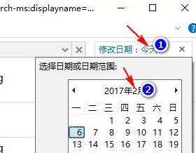 3、當(dāng)我們點(diǎn)擊“今天”,就會(huì)彈出“日期或日期范圍”選項(xiàng)框,點(diǎn)擊選擇框頂部的“2017年2月”,注意看,你會(huì)發(fā)現(xiàn)搜索框中的“修改日期”已經(jīng)變成了一個(gè)日期范圍“2017/2/1 .. 2017/2/28”。如圖: