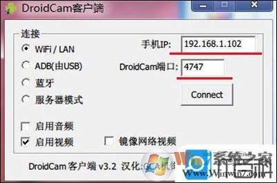 3、先運(yùn)行手機(jī)端。然后在PC上運(yùn)行這個(gè)bat文件一次,Win7旗艦版再運(yùn)行DroidCam客戶端,選擇連接方式為“ADB(由USB)”,點(diǎn)擊Conect。如果不運(yùn)行bat或者設(shè)置的端口與bat內(nèi)的不一致,會(huì)有錯(cuò)誤提示。