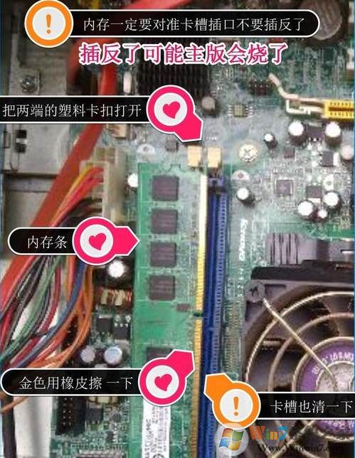 4、打開機(jī)箱,對主機(jī)里的內(nèi)存、顯卡、CPU重新安裝,記住灰塵也用吹風(fēng)機(jī)清理一下。Windows7系統(tǒng)之家整理 m.cncxm.com