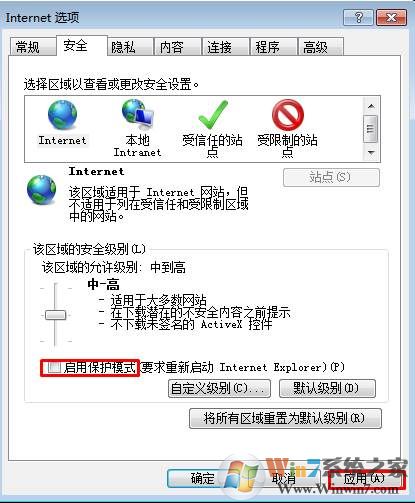 1、打開(kāi)IE瀏覽器后,點(diǎn)擊工具—internet選項(xiàng),然后在安全選項(xiàng)卡下,取消勾選“啟動(dòng)用保護(hù)模式”;