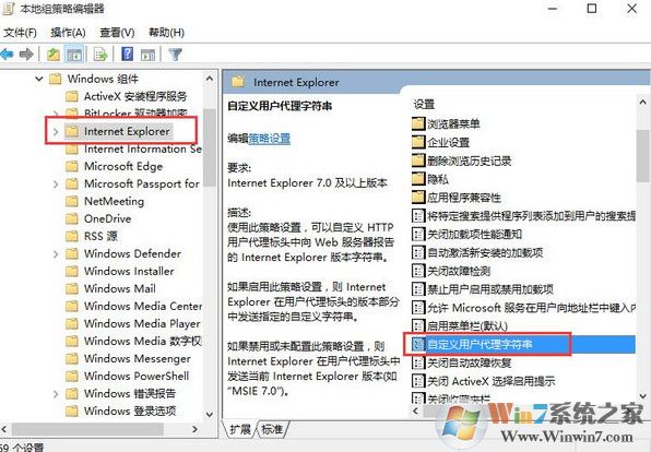 2、在打開的界面中,依次打開“計算機配置-管理模板-Windows組件-Internet explorer”,然后在右側窗口找到并打開“自定義用戶代理字符串”,如下圖所示: