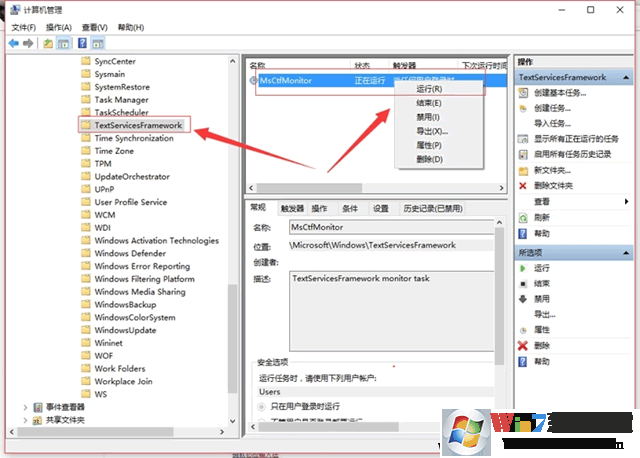 4、右側可以看到名為MsCtfMonitor的任務計劃程序,右鍵單擊MsCtfMonitor,選擇“運行”(如圖)。當MsCtfMonitor任務計劃程序狀態(tài)變?yōu)?ldquo;正在運行”,輸入法切換即恢復正常。