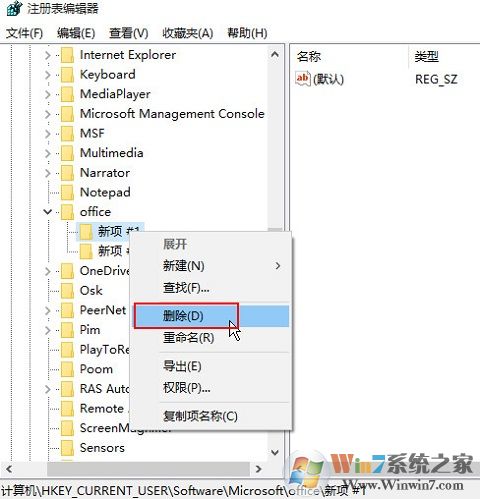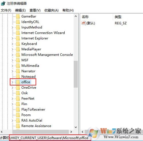 3、將注冊表編輯器左欄的“office”及其子項刪除,然后退出注冊表編輯器即可,如下圖所示: