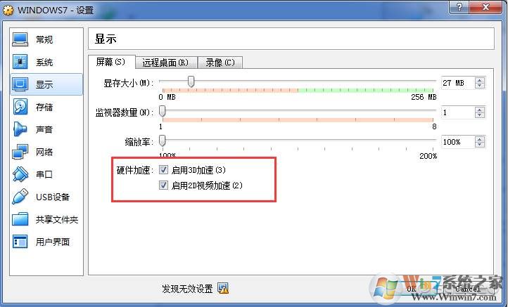 2、在 [顯示-顯卡] 配置頁,勾選 [啟用3D加速] 和 [啟用2D視頻加速],這樣虛擬電腦將可使用顯卡的視頻加速能力。