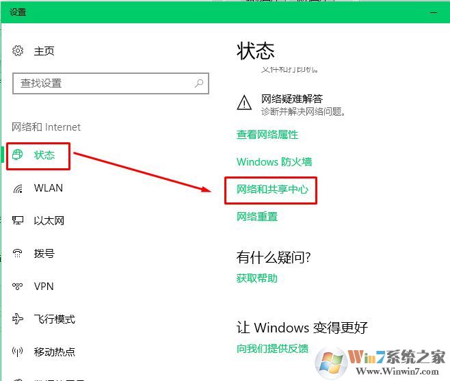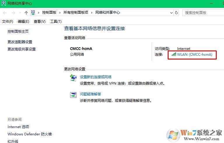 2、選擇網(wǎng)絡(luò)和共享中心,點(diǎn)擊現(xiàn)在連接的網(wǎng)絡(luò)名稱(chēng);