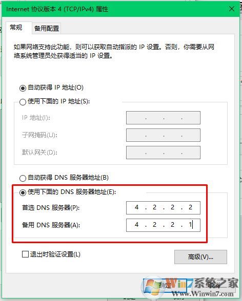 4、將其中的首選DNS服務(wù)器設(shè)置為”4.2.2.2“,備用DNS服務(wù)器設(shè)置為”4.2.2.1“。