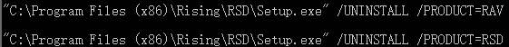 "C:\Program Files\Rising\RSD\Setup.exe" /UNINSTALL /PRODUCT=RAV