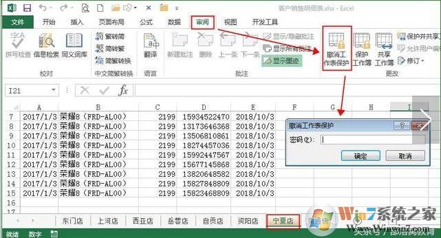 小編這個(gè)Excel“客戶銷售明細(xì)表”文件,包含8張Excel工作表,其中第七張(sheet7)是“寧夏店”的銷售數(shù)據(jù)。從圖中,可以看到這個(gè)工作表是有密碼的,單擊“撤銷工作表保護(hù)”,要求我們輸入密碼,可是密碼忘記了,下面小編就一步一步檔例帶大家破解他。