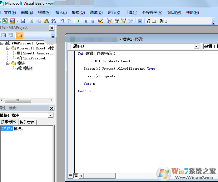 3、把下面的代碼復(fù)制過去→然后把光標(biāo)點(diǎn)到代碼里→F5運(yùn)行一下→工作表保護(hù)就破解了。